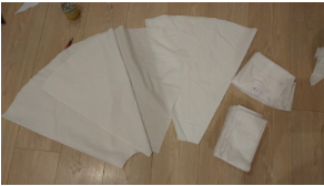 בד גזור לפי הגזרה לחצאית הבסיס הלבנה – מימין רואים את הרצועות שיהפכו אחר כך להיות המלמלה במכפלת החצאית.